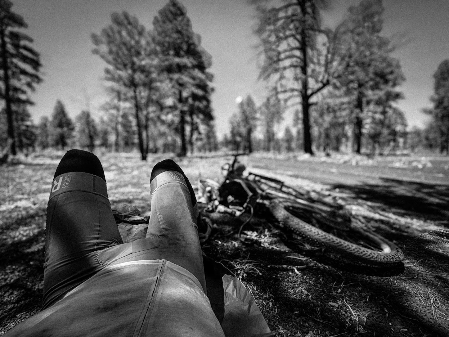I numbed my thoughts on mortality with one of the finest naps of my life. The air temperatures were that of a warm blanket. The afternoon light was dappled through the pinyons. The earth around me wasn’t dirt, it was volcanic pumice soil. It was soft like piles of popcorn burned to bare carbon a thousand years ago. I didn’t need a bivvy sack, or a sleep kit, or a jacket. I simply lay my bike down, burrowed my backside into the soil with a wiggle, and drifted off to sleep for a blissful 30 minutes. The strategy here was to bank some sleep when it was logistically easiest to do so. I wanted to finish that night, in about 12 hours, and I wanted to do so with no more major stops. Somewhere during the nap, 3rd place passed me once again, but nothing mattered. I laid there in the black pumice and became singularly at peace with all of my life choices. This is why I was out here. Peace in the eye of the storm.
