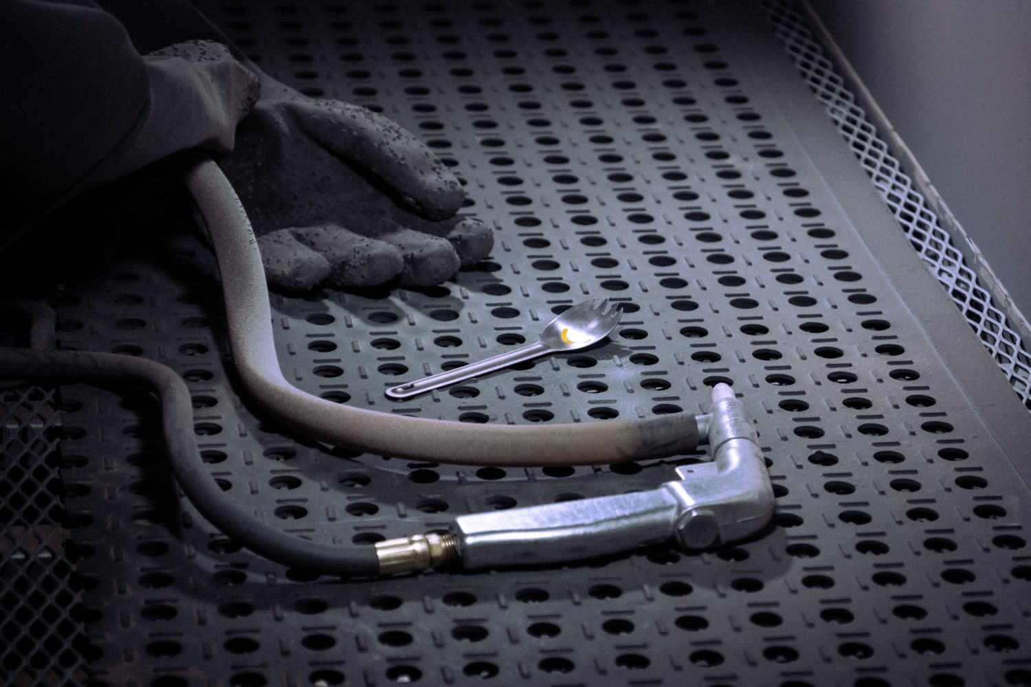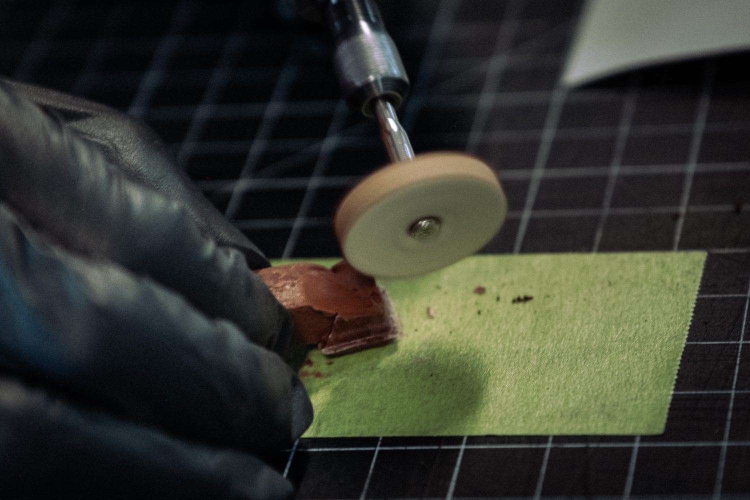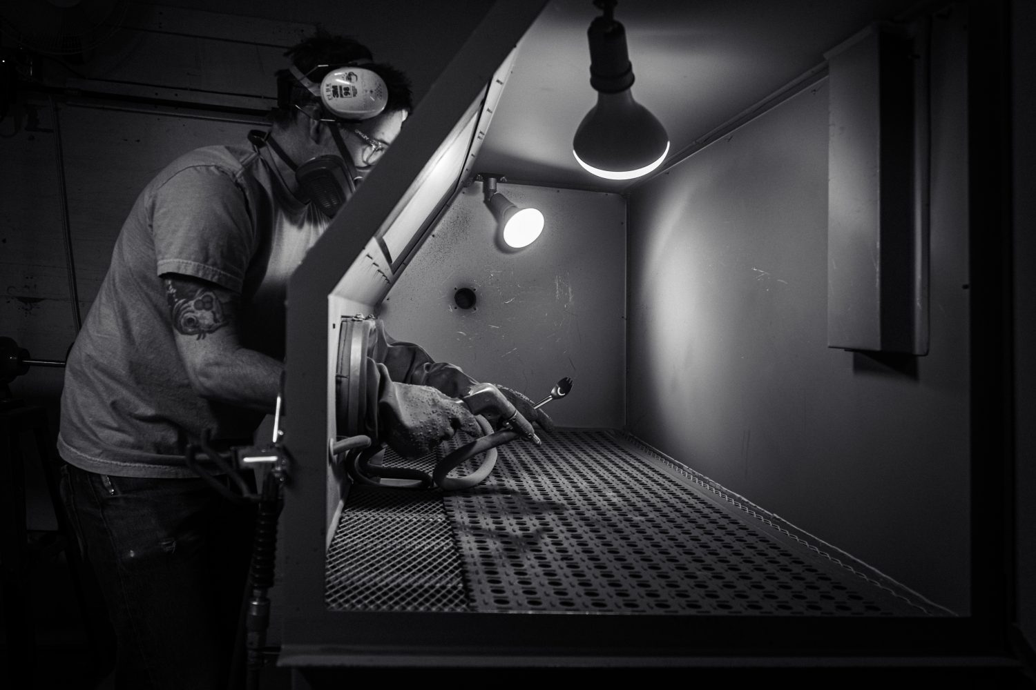 We want that smile to pop, so we blast everything else back to satin in our media blaster.