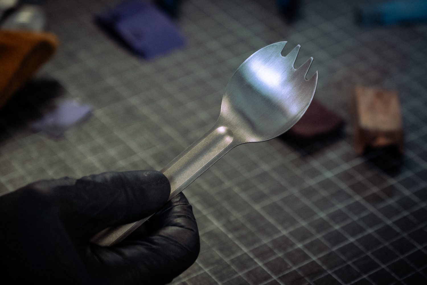 Finally, this year, in a seventeen hour all hands on deck marathon meeting, we finally solved it: What if the smile was brushed and bright, and the rest of the Spork was satin, the way pretty much every titanium Spork in the world already was?