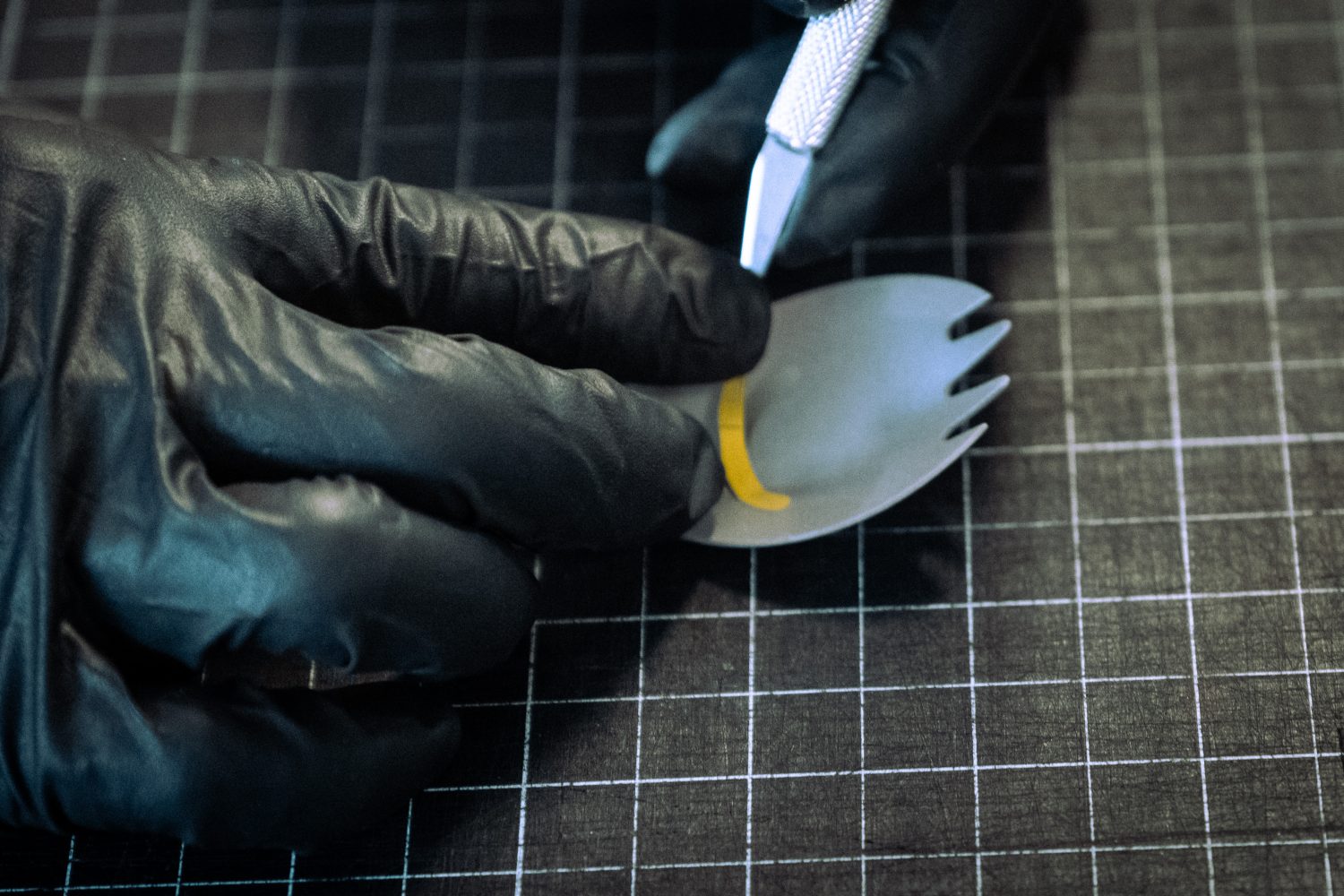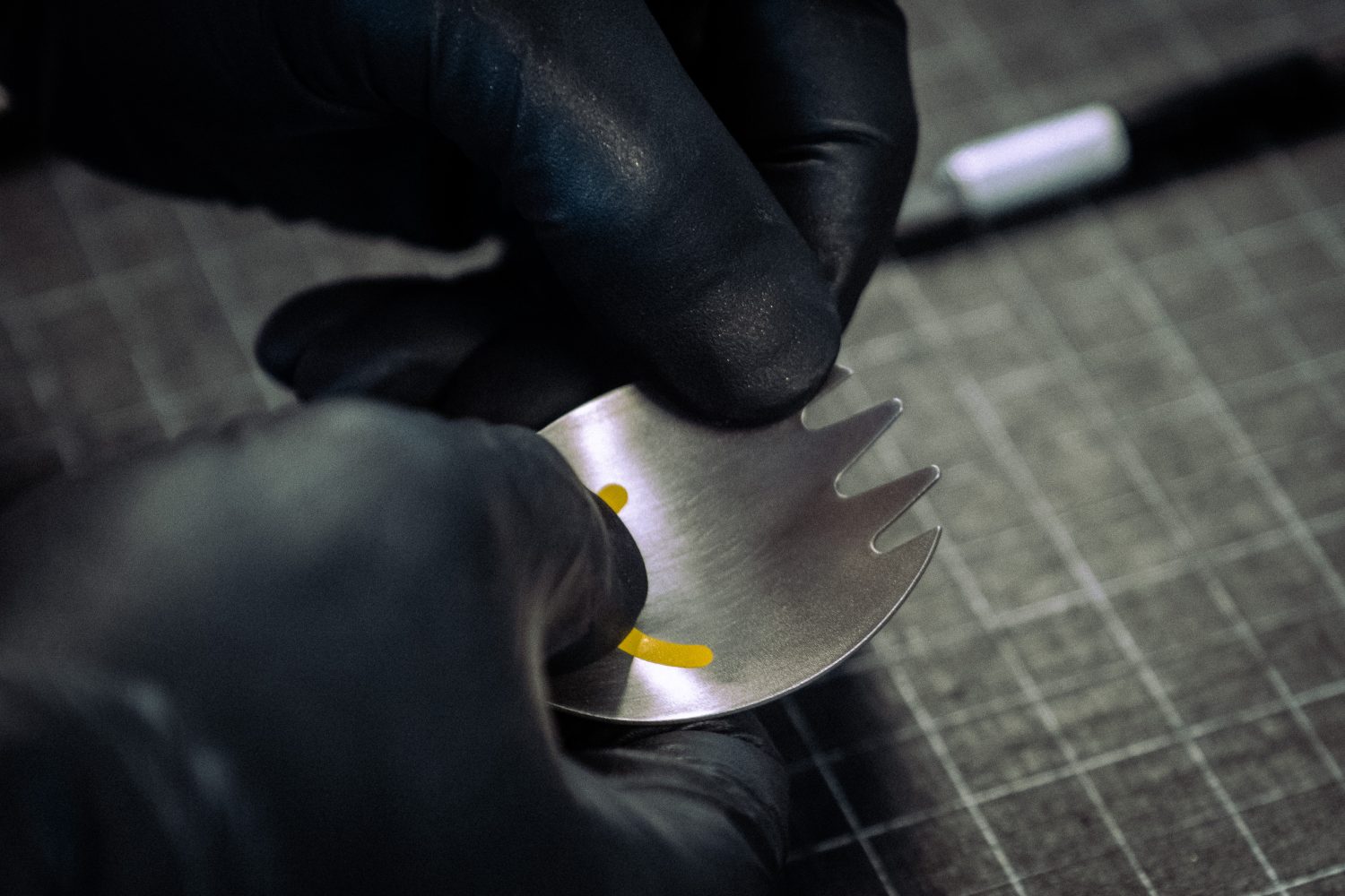 This is the best part: We peel back the yellow masking to reveal the gleaming smile contrasted against the satin titanium Spork. Joy floods the room.